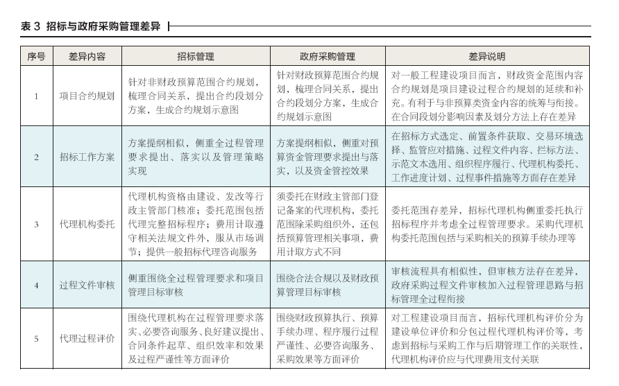 工程建設項目招標管理是指站在建設全過程視角對招標活動實施的一系列管理工作。同理,政府采購管理指采購人針對擬組織實施的采購活動開展的一系列管理工作。政府采購管理過程除遵循財政預算控制要求外,依然需將全過程思想貫穿始終。上述兩類活動管理目標均包括降低過程風險、提升交易效率、確保交易質量、滿足全過程管理要求等。招投標或政府采購管理工作內容均包括:合約規劃、工作方案編制、代理機構委托、過程文件審核、招標與采購代理過程評價等方面。針對上述內容,兩類活動有關差異內容詳見表3。